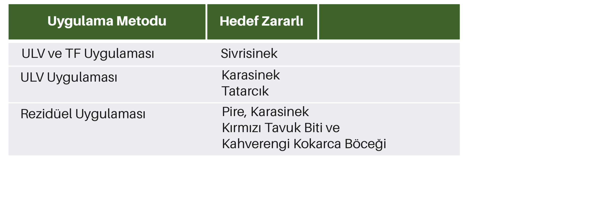 Kahverengi Kokarca Böceği, Pire, Kırmızı Tavuk Biti ve Karasinekler için; kalıcı yüzey uygulama metodu kullanılmalıdır.